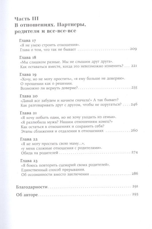 Книга посвящена отношениям человека с собой и другими и освещает самые распространенные проблемы, с которыми люди приходит к психологу: неуверенность, неспособность отпустить прошлое, неумение собраться с силами, ревность, вина, зависть, безысходность, сожаление об упущенных возможностях, потребность в любви, раздражение на весь мир, горе потери… Автор — практикующий психолог, гештальт-терапевт и семейный консультант, рассматривает серьезные вопросы через призму историй, основанных на реальных случаях из практики, давая читателям советы о том, как правильно распознать и проработать то или иное негативное состояние, обрести гармонию и радость жизни. • Разбор распространенных поведенческих проблем с психологом, гештальт-терапевтом, семейным консультантом с 15-летним опытом • Изучение сложных ситуаций (тревоги, страха, неврозов, раздражения, обиды, вины) на реальных примерах из практики • Советы и техники для понимания и коррекции ситуаций. В конце каждой главы — авторские резюме для закрепления важной информации.