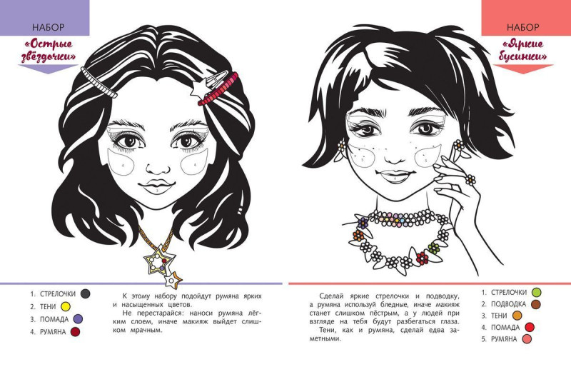 Эта раскраска - отличный путеводитель для маленьких феечек и начинающих волшебниц в играх с цветом при создании образов. Она раскроет все секреты создания гармоничного макияжа и перевоплощения. Старайтесь раскрашивать по указанным линиям теми цветами, что обозначены в кружочках, это поможет развитию воображения и вкуса. Для раскрашивания подойдут как акварельные краски, так и фломастеры и мелки. Особенно смелые могут раскрашивать прямо детской косметикой с помощью пальца или ватной палочки. Успехов!