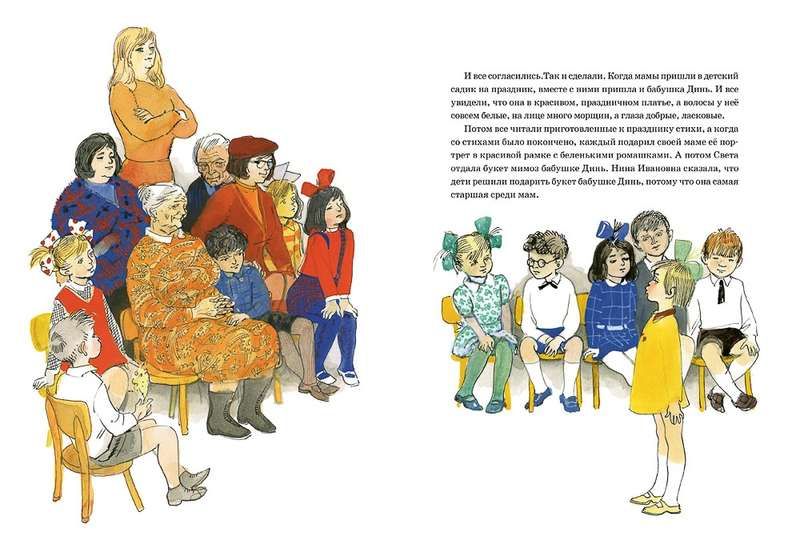 В одном детском саду к празднику Восьмого марта дети решили устроить выставку фотографий своих мам. И никак не могли решить, чья мама красивее. А Славик Смирнов самой красивой считает свою бабушку Дину, ведь для каждого из нас всех красивее тот человек, которого мы любим больше всего на свете. Книга проиллюстрирована художником Германом Алексеевичем Мазуриным.