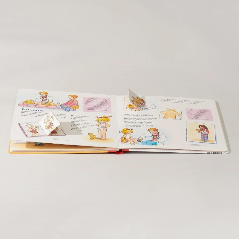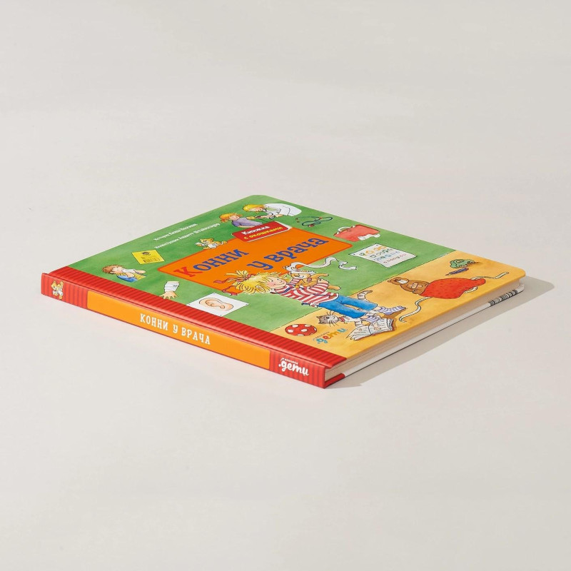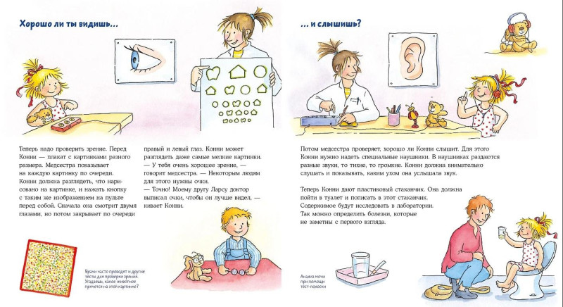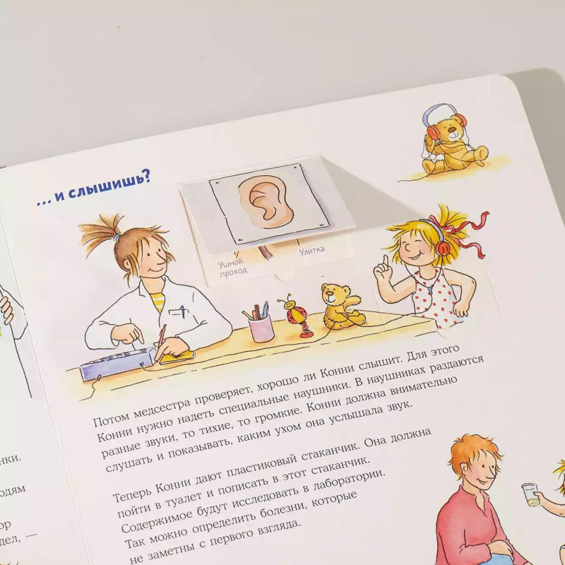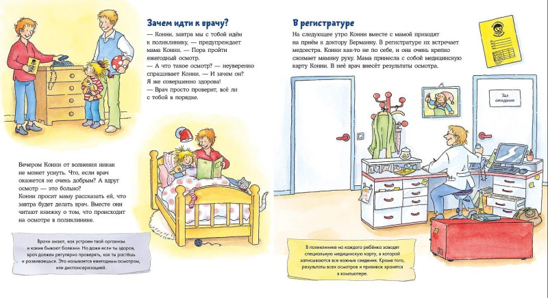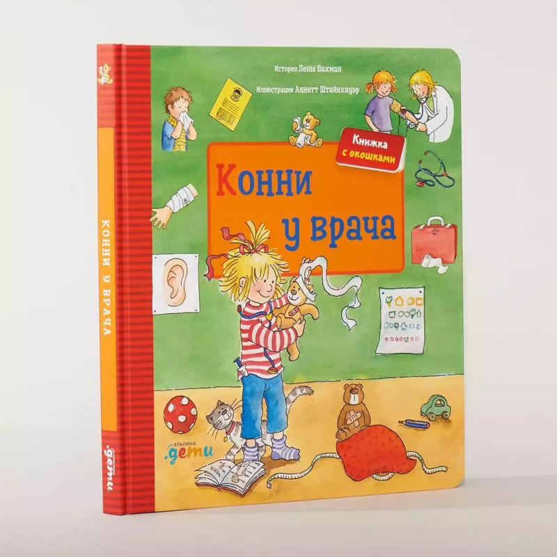 Если заранее подготовить малыша к походу в поликлинику, визит к доктору может пройти довольно спокойно. Конни, например, не боится ходить к врачу. Мама объяснила ей, зачем нужны осмотры, и теперь Конни знает, что это совсем не страшно! Вместе с Конни малыш: • перестанет бояться докторов; • познакомится с медицинскими приборами. Особенности: А ещё в книжке с окошками можно открыть дверь в любой кабинет и даже посмотреть, что лежит у доктора в ящиках! Обо всём расскажем, а главное, покажем! Новые книги-картонки с окошками от Конни познакомят малыша с окружающим миром в игровой форме. • Картинки-окошки • Советы и правила • Научные факты и истории из жизни О серии: Вот уже 20 лет малыши во всем мире растут вместе с Конни — доброй девочкой в забавной полосатой футболке. С этими книгами ребенок перестанет бояться врача, первого дня в садике или школе, поймет, что животные в доме — это большая ответственность. Серия охватывают все жизненные навыки, с которыми ребенок встречается во время взросления от 3 до 15 лет. Ассоциируя себя с главной героиней, малыш проживает ее историю, учится и познает мир. Для кого: Для детей от 4 лет, мальчиков и девочек .