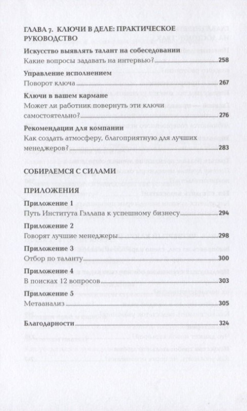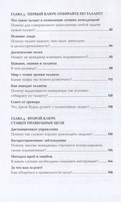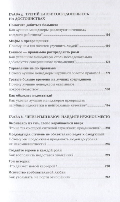Даже самая несложная работа требует таланта. Думать, что любого можно научить выполнять любую работу и что дело только в системе стимулирования и амбициях, - значит путать таланты, знания и навыки. Талант - вещь врожденная, знания и навыки - дело наживное. Книга подводит итог грандиозной двадцатипятилетней работы Института Гэллапа, суть которой сводится к тому, что людей изменить невозможно и не стоит требовать от них того, что им не дано. Нужно выявлять их существующие таланты и помогать раскрывать сильные стороны. Совпадение способностей человека и роли, которую он выполняет, - вот к чему должен стремиться каждый менеджер.