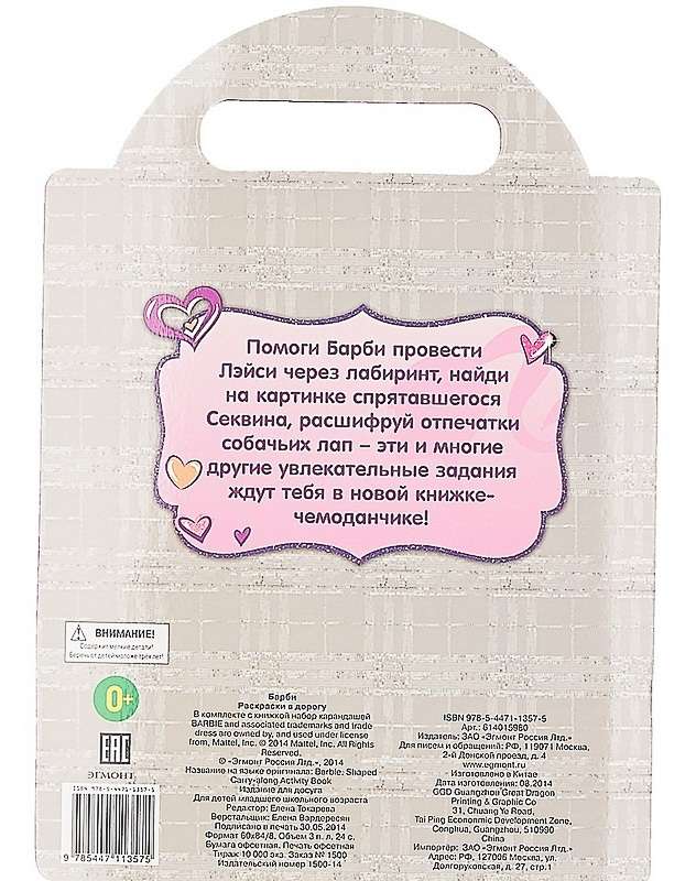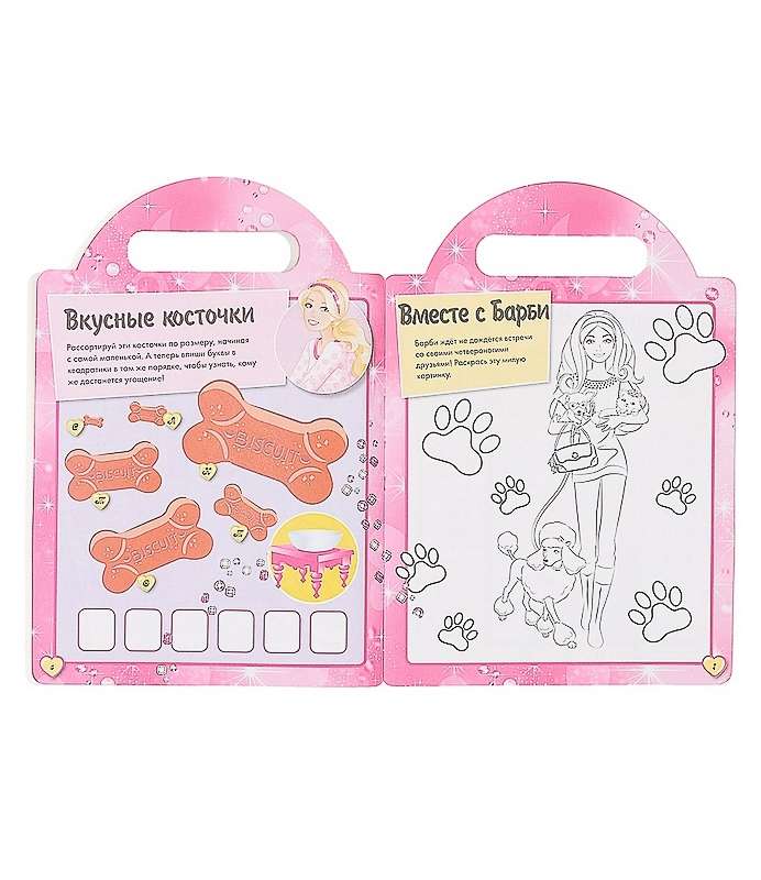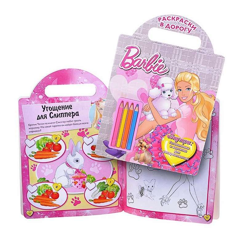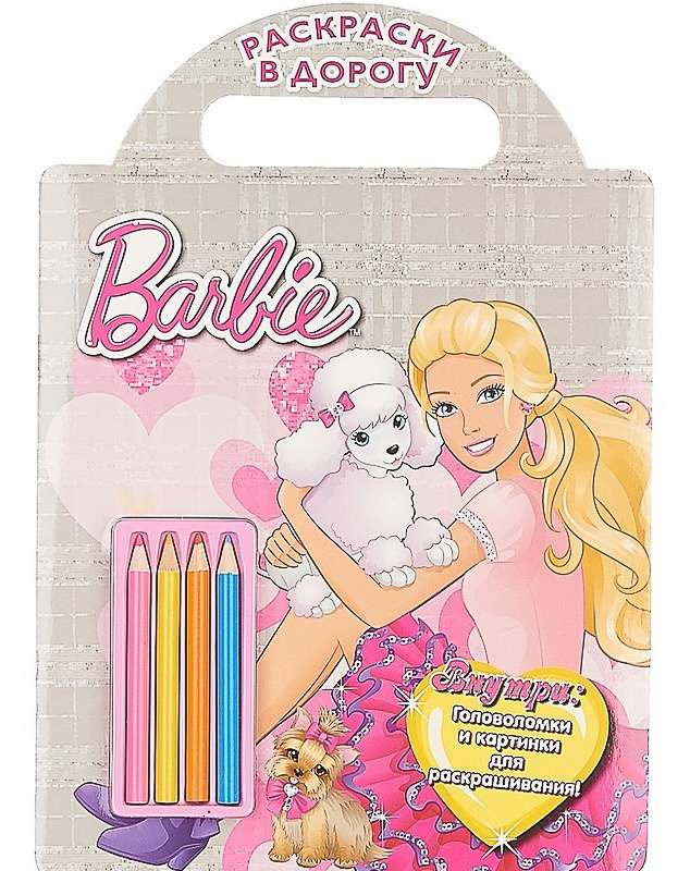 Книга с вырубкой. Помоги Барби провести Лэйси через лабиринт, найди на картинке спрятавшегося Секвина, расшифруй отпечатки собачьих лап - эти и многие другие увлекательные задания ждут тебя в новой книжке-чемоданчике. К изданию прилагается набор из 4 карандашей длиной 8,5 см. Цвета: розовый, желтый, оранжевый, синий.