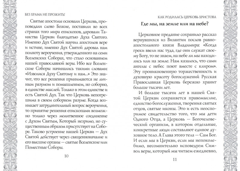 В храмах открывается особое присутствие Божие, особое благодатное действие Духа Святого, освящающее и оживотворяющее, дающее силы жить и спасаться, с любовью и помощью Божией идти по пути своего земного странствия. Поэтому, по мысли архимандрита Мелхиседека (Артюхина), автора книги «Без храма не прожить!», по возможности свое свободное время надо отдавать храму, где Царство Божие реальным образом открывается в богослужении, где Сам Господь невидимым образом зрит наши молитвы, прошения и воздыхания сердечные.