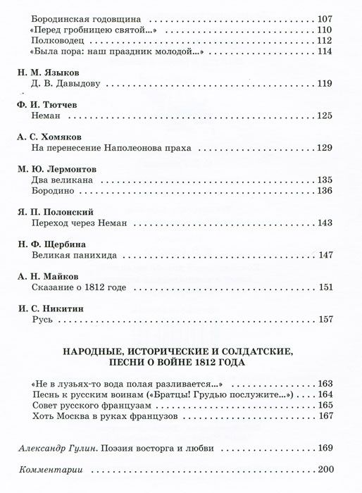 Этот сборник - поэтическая летопись Отечественной войны 1812 года, написанная разными поэтами на протяжении XIX века. Среди них - Г. Державин и И. Крылов, А. Пушкин и В. Жуковский, Ф. Глинка и Д. Давыдов, А. Майков и Ф. Тютчев и др. В книгу включены также исторические и солдатские песни, посвященные событиям той войны. Подарочное издание приурочено к 200-летнему юбилею победы нашего народа в Отечественной войне 1812 года. Для старшего школьного возраста. Составитель: Гулина А.В.