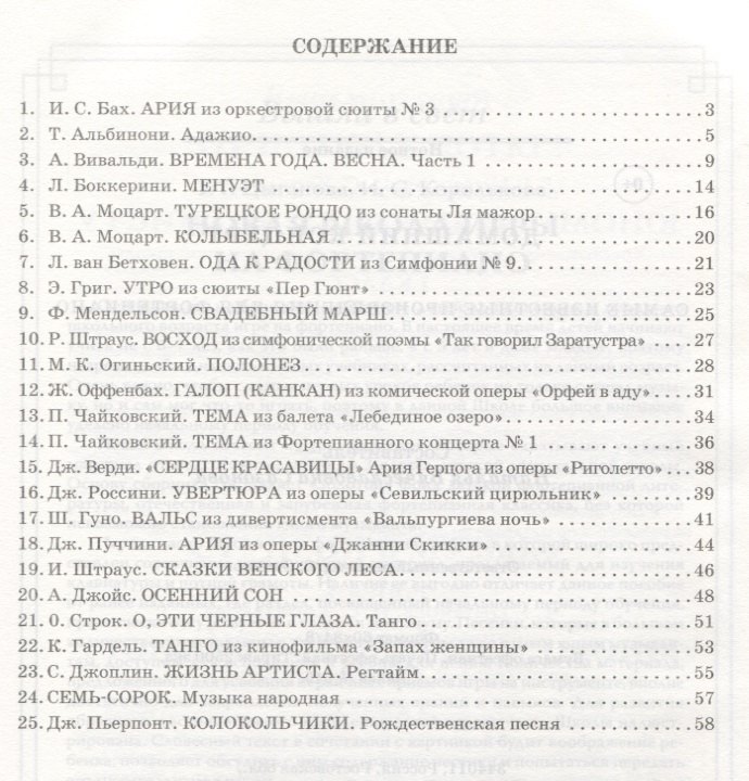 В сборник "Домашний концерт" вошли самые любимые произведения разных эпох: знаменитые классические пьесы Баха, Вивальди, Моцарта, Бетховена, фрагменты из опер Россини, Верди, Гуно и Пуччини, балета "Лебединое озеро" Чайковского, а также популярные вальсы, танго, народные песни и джазовые композиции. Многие пьесы даны в облегченном изложении. Не сомневаемся, что каждый музыкант найдёт в этом издании своё любимое произведение.