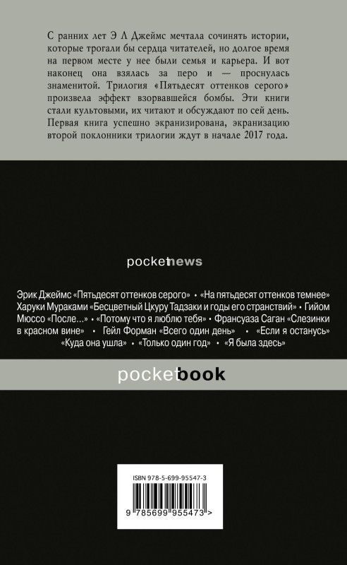 С ранних лет Э. Л. Джеймс мечтала сочинять истории, которые трогали бы сердца читателей, но долгое время на первом месте у нее были семья и карьера. И вот наконец она взялась за перо и — проснулась знаменитой. Трилогия «Пятьдесят оттенков серого» произвела эффект взорвавшейся бомбы. Эти книги стали культовыми, их читают и обсуждают по сей день.