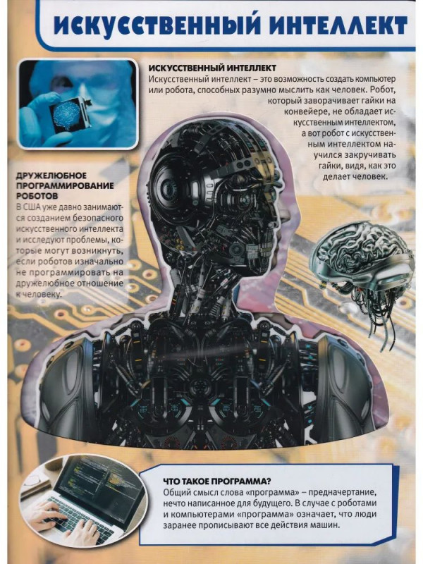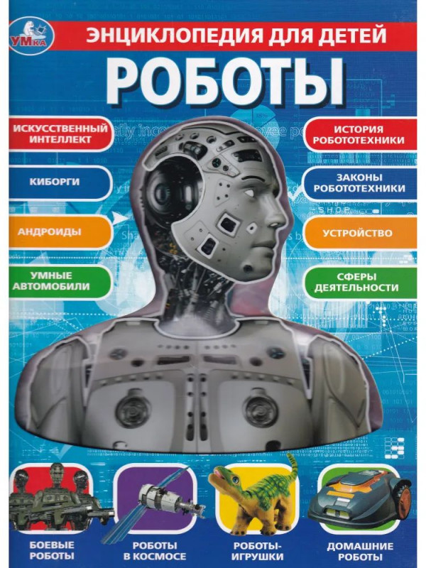 Яркая и красочная энциклопедия познакомит ребёнка с удивительными роботами, расскажет о видах роботов, о том какие бывают роботы в фантастических фильмах и книгах и как реальные роботы используются в науке и даже дома, поведает об их устройстве, а также об истории и законах робототехники. Можно изучать роботов через прозрачные окошки. Зрелищные фото и удивительные факты о робототехнике увлекут ребёнка и помогут ему быстро, эффективно и с удовольствием усвоить новую информацию.