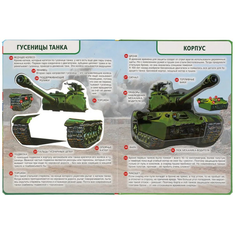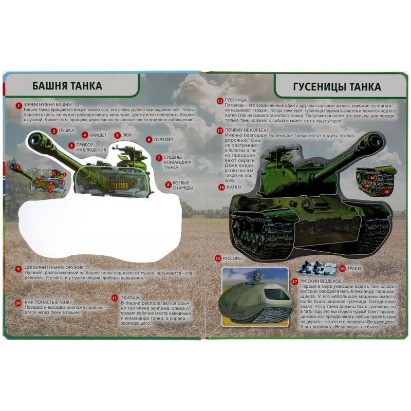 Ребёнок узнает о строении танка (двигатель, броня, гусеницы), а прозрачное окошко сделает чтение ещё более увлекательным.