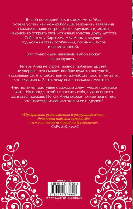 18+ НЕЗАКОННОЕ ПОТРЕБЛЕНИЕ НАРКОТИЧЕСКИХ СРЕДСТВ, ПСИХОТРОПНЫХ ВЕЩЕСТВ, ИХ АНАЛОГОВ ПРИЧИНЯЕТ ВРЕД ЗДОРОВЬЮ, ИХ НЕЗАКОННЫЙ ОБОРОТ ЗАПРЕЩЕН И ВЛЕЧЕТ УСТАНОВЛЕННУЮ ЗАКОНОДАТЕЛЬСТВОМ ОТВЕТСТВЕННОСТЬ В свой последний год в школе Лина Уйаз хотела успеть как можно больше: заполнить заявления в колледж, чаще встречаться с друзьями и, может, наконец-то открыть свои истинные чувства другу детства Себастьяну Харвеллу. Для Лины грядущий год должен стать особенным, полным шансов и возможностей..Вот только один неверный выбор может все разрушить….Теперь Лина не строит планов, избегает друзей, не уверена, что сможет вообще куда-то поступить, и сомневается, что Себастьян когда-нибудь простит ее за то, что случилось. За то, чему она позволила случиться….Чувство вины, растущее с каждым днем, мешает девушке жить. Но иногда, чтобы простить себя, нужно просто двигаться дальше. Но как Лина сможет смириться с тем, что навсегда изменило жизни ее и друзей?..