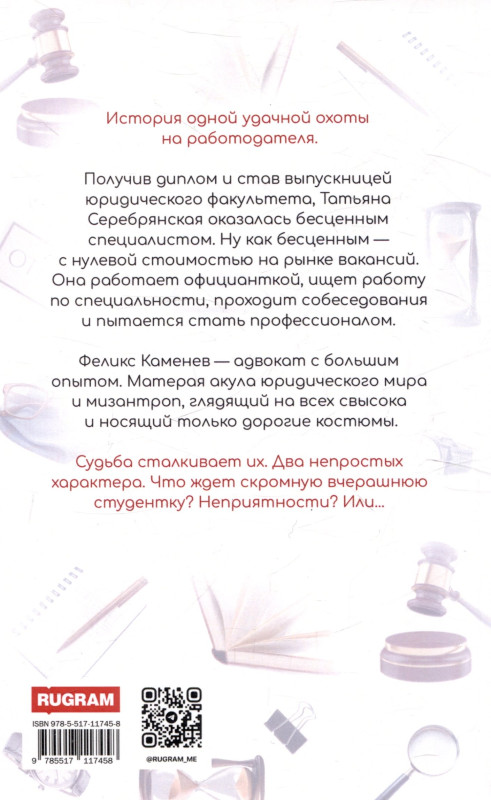История одной удачной охоты на работодателя. Получив диплом и став выпускницей юридического факультета Татьяна Серебрянская оказалась бесценным специалистом. Ну как бесценным с нулевой стоимостью на рынке вакансий. Она работает официанткой, ищет работу по специальности, проходит собеседования и пытается стать профессионалом. Феликс Каменев адвокат, с большим опытом. Матерая акула юридического мира и мизантроп, глядящий на всех свысока и не носящий костюмов, дешевле пары сотен долларов.Судьба сталкивает их. Два непростых характера.Что ждет скромную вчерашнюю студентку? Неприятности