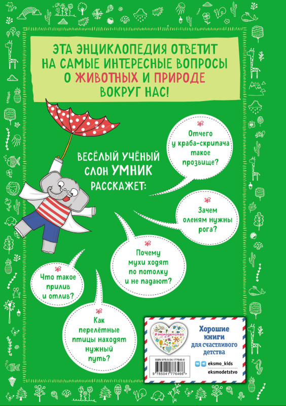 Эта компактная энциклопедия для детей содержит ответы на все самые интересные вопросы о природе! Весёлый слон Умник раскроет любознательному ребёнку невероятные тайны животных и объяснит, зачем мухи потирают лапки, почему кошачьи глаза сверкают в темноте, отчего у рыб короткая память, а также даст множество других увлекательных сведений об окружающем мире.