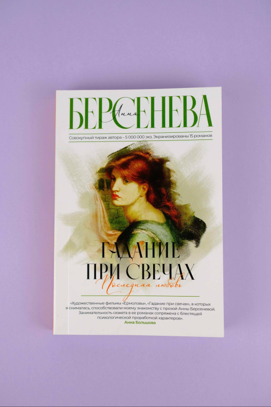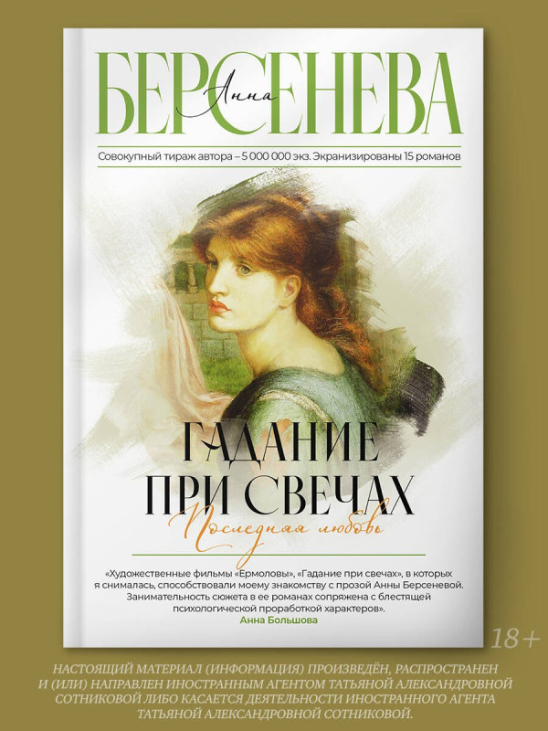 «Художественные фильмы «Ермоловы», «Гадание при свечах», в которых я снималась, способствовали моему знакомству с прозой Анны Берсеневой. Занимательность сюжета в ее романах сопряжена с блестящей психологической проработкой характеров. Ты с головой погружаешься в захватывающее исследование граней человеческой души, обстоятельств, повлиявших на ее формирование. Работать над ролью берсеневских героев – удовольствие». Анна Большова