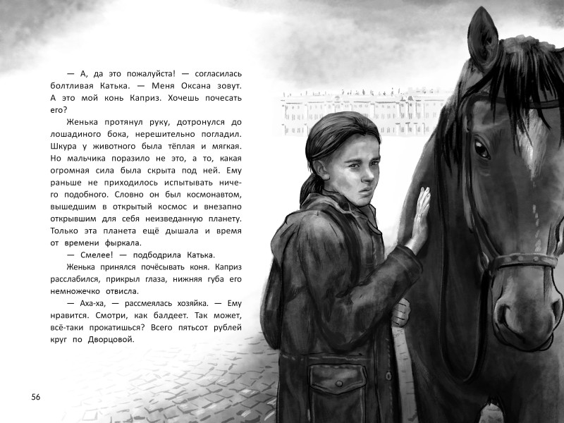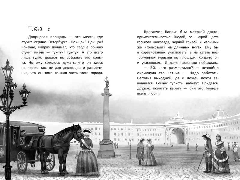 Эта история вместила в себя многое. И атмосферу величественного Петербурга с его гранитными набережными, роскошными дворцами и непревзойдёнными скульптурами. И переживания мальчика, который учится в художественной школе и мечтает помочь своему необычному другу. И стремление к вольной жизни прекрасного коня Каприза, катающего туристов по Дворцовой площади. Эти три мотива переплетаются воедино, чтобы дополнить друг друга и дать повод для размышлений. Правда ли, что даже один маленький человек в силах совершить большое добро? Всегда ли рядом оказываются те, кто может помочь? И нужно ли иногда отпустить того, кого любишь, чтобы сделать его счастливым?