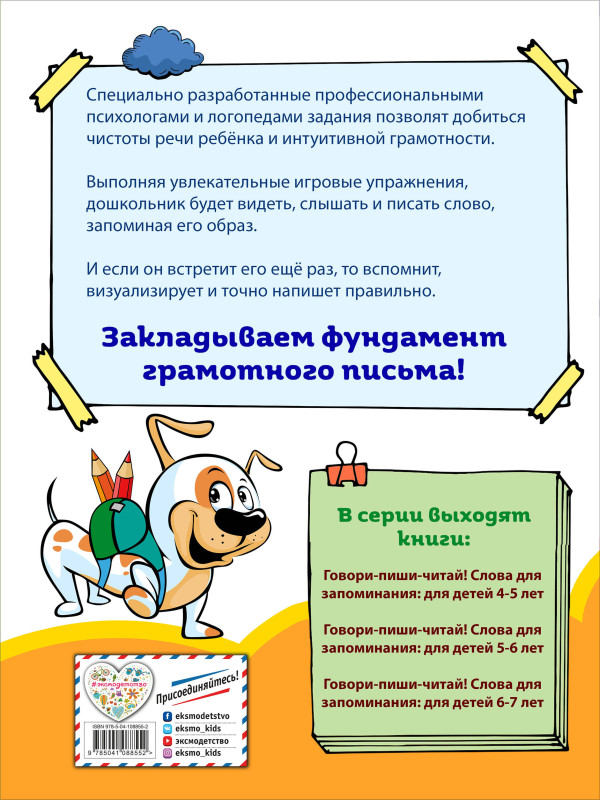 Как ребёнок произносит слова, так он будет их читать и писать, поэтому важно научить его правильно произносить все звуки в словах. Книга включает в себя комплекс заданий со словами, которые малыш учится правильно произносить, писать и читать. Слова подобраны профессиональными психологами и логопедами согласно возрастным нормам произношения звуков. Выполняя задания, ребёнок будет видеть, как пишется слово, обводить его по пунктиру и учиться правильно произносить. При этом одновременно работают зрительная, слуховая и моторная память. И когда ребёнок в будущем столкнётся с этим словом на письме или в тексте, он мысленно его произнесёт, визуально вспомнит и правильно напишет или прочтёт.