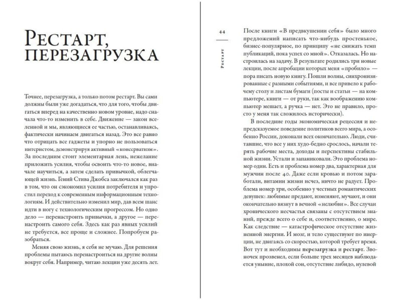 Что делать, если все вокруг потеряло смысл, раздражает или просто надоело? Как начать сначала, когда нет сил, вдохновения и кажется, что все пошло не так? Ирина Хакамада предлагает свои знания и опыт. Она рассказывает о потерях и обретениях, о мотивации и энергии, о том, как включить кнопку «перезагрузки» и не бояться начинать с нуля.