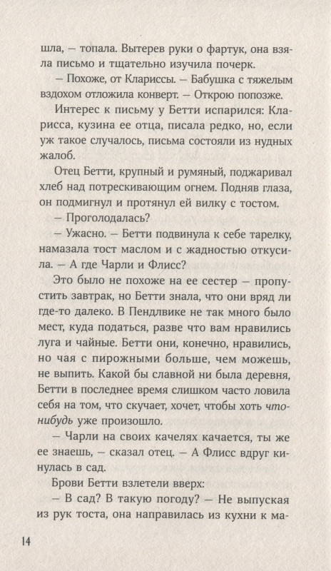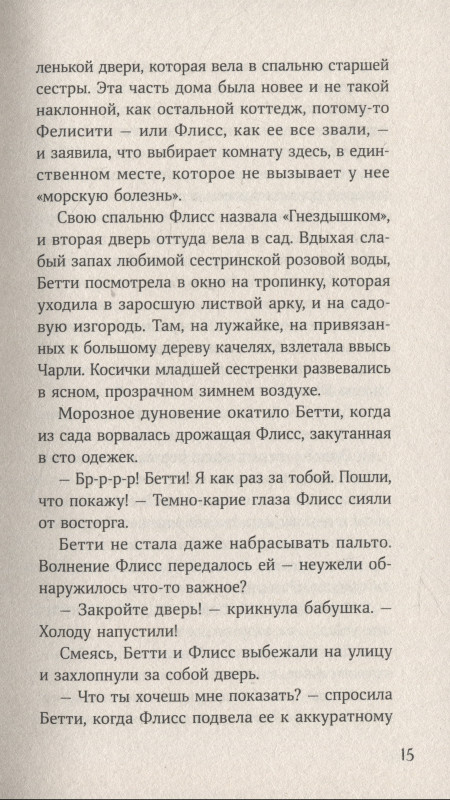 Удк 821.111 Ббк 83.3(4) Х21 Перевод Марии Брауде и Екатерины Пташкиной Редактор Мария Брауде Харрисон М. Х21 Вихрь колдовства / Мишель Харрисон ; Пер. с англ. — М. : Альпина Паблишер, 2023. — 382 с. : ил. ISBN 978-5-9614-8598-1 Волшебное продолжение приключений сестер Уиддершинс. Бетти, Чарли и Флисс вместе со своей бабушкой отправляются на север, в поселок Глухомань. Ярмарка, замерзшее озеро и старинная гостиница — здесь повсюду витает дух приключений, но стоит ли ждать от них добра? Слухи о гибели таинственного разбойника и его возлюбленной живы в Глухомани и спустя сорок лет. Сестры Уиддершинс должны выяснить правду и предотвратить беду. Какие же секреты скрывает коварный лед?