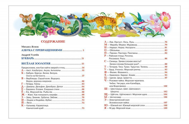 В сборник вошли стихотворные азбуки, написанные замечательными детскими поэтами - «Букварь» и «Веселая зоология» (от Аиста до Ягуара!) Андрея Усачева и «Азбука с превращениями» Михаила Яснова. Веселые азбуки помогут ребенку быстрее освоить буквы, приучат его обращать внимание на слоги и звуковые сочетания, а самое главное - привьют вкус и любовь к чтению. Иллюстрации А. Лебедева, Л. Ереминой.