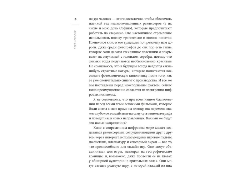 Создатель "Крестного отца", "Апокалипсиса сегодня", "Дракулы" и других киношедевров не устает быть новатором и теперь. По мнению Фрэнсиса Форда Копполы, будущее кинематографа - за новой формой искусства, которое он назвал "живое кино". Оно объединит все лучшее, что придумано и успешно используется в кино, телевидении и театре. Такой фильм, снятый одним дублем, в режиме реального времени, с элементами сценической постановки и использованием новейших технологий, по уверению автора, даст режиссерам больше творческой свободы, а зрителям - ощущение, что они смотрят кино прямо в процессе его создания. В этой книге Коппола рассказывает о трудностях, с которыми столкнулся при подготовке и съемках "живого кино", размышляет об особенностях работы с актерами и построения кадра.