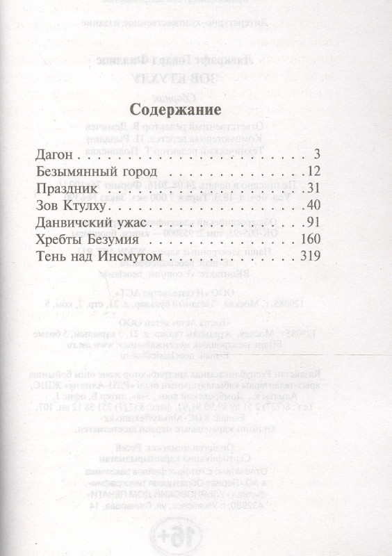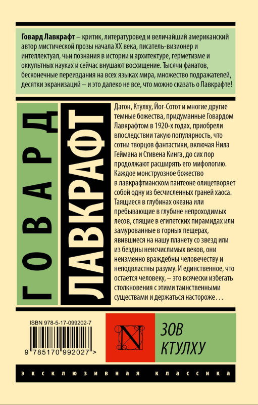 18+ НЕЗАКОННОЕ ПОТРЕБЛЕНИЕ НАРКОТИЧЕСКИХ СРЕДСТВ, ПСИХОТРОПНЫХ ВЕЩЕСТВ, ИХ АНАЛОГОВ ПРИЧИНЯЕТ ВРЕД ЗДОРОВЬЮ, ИХ НЕЗАКОННЫЙ ОБОРОТ ЗАПРЕЩЕН И ВЛЕЧЕТ УСТАНОВЛЕННУЮ ЗАКОНОДАТЕЛЬСТВОМ ОТВЕТСТВЕННОСТЬ Дагон, Ктулху, Йог-Сотот и многие другие темные божества, придуманные Говардом Лавкрафтом в 1920-е годы, приобрели впоследствии такую популярность, что сотни творцов фантастики, включая Нила Геймана и Стивена Кинга, до сих пор продолжают расширять его мифологию. Каждое монструозное божество в лавкрафтианском пантеоне олицетворяет собой одну из бесчисленных граней хаоса. Таящиеся в глубинах океана или пребывающие в глубине непроходимых лесов, спящие в египетских пирамидах или замурованные в горных пещерах, явившиеся на нашу планету со звезд или из бездны неисчислимых веков, они неизменно враждебны человечеству и неподвластны разуму. И единственное, что остается человеку – это всячески избегать столкновения с этими таинственными существами и держаться настороже…