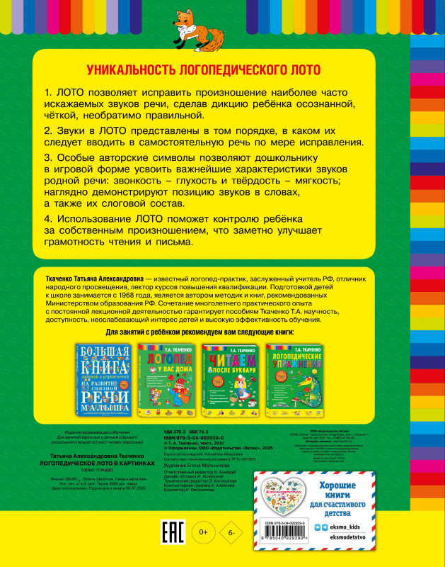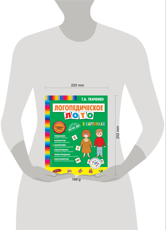 Татьяна Ткаченко — заслуженный учитель России, логопед, она написала уже более 50 книг и учебно-методических пособий для дошкольников. Правильное произношение необходимо ребёнку для уверенного общения, успешного обучения, грамотного чтения и письма, гармоничного развития. Во всех книгах Татьяны Александровны представлены элементы её авторской методики. Практическая часть её методики — работа с логопедическим лото — набором карточек, которые помогут не только логопедам, но и родителям, и воспитателям в игровой форме выучить слова и их правильное произношение.