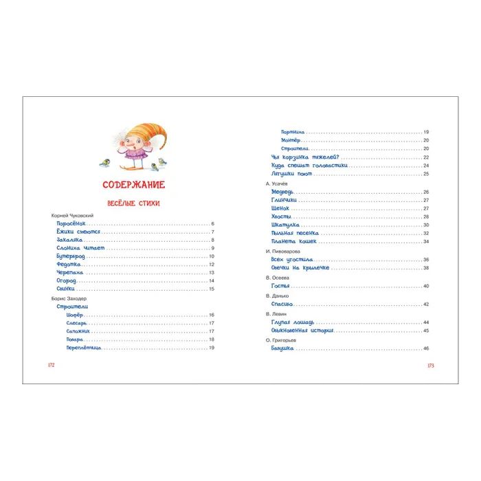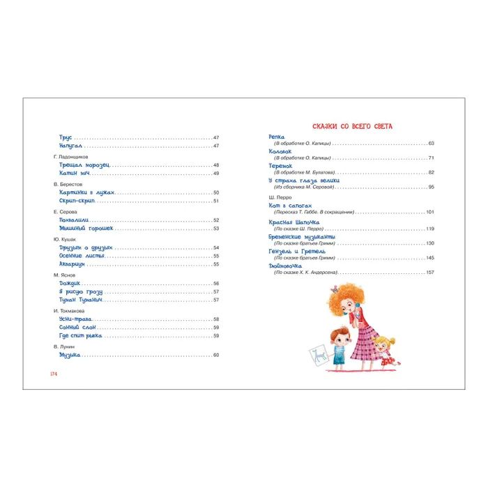 В сборник вошли весёлые стихи любимых детских поэтов, в том числе Корнея Чуковского, Бориса Заходера, Андрея Усачёва, а также сказки со всего света, рекомендованные для чтения детямдошкольного возраста: «Красная Шапочка», «Дюймовочка», «Кот в сапогах», «Репка», «Теремок», «Колобок» и многие другие.