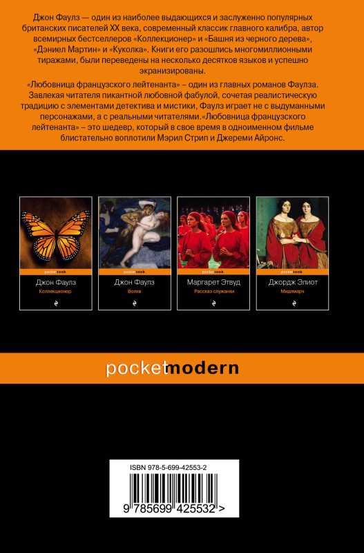 18+ НЕЗАКОННОЕ ПОТРЕБЛЕНИЕ НАРКОТИЧЕСКИХ СРЕДСТВ, ПСИХОТРОПНЫХ ВЕЩЕСТВ, ИХ АНАЛОГОВ ПРИЧИНЯЕТ ВРЕД ЗДОРОВЬЮ, ИХ НЕЗАКОННЫЙ ОБОРОТ ЗАПРЕЩЕН И ВЛЕЧЕТ УСТАНОВЛЕННУЮ ЗАКОНОДАТЕЛЬСТВОМ ОТВЕТСТВЕННОСТЬ На первый взгляд "Любовница французского лейтенанта" — это пикантная история страсти, разыгранная в гениально воссозданных декорациях викторианской Англии. Герои так же чопорны, благородны и... безвольны. Что их ждет — банальный адюльтер или решение вечного конфликта между долгом и чувством?\r Для менее поверхностного читателя "Любовница французского лейтенанта" — это книга-игра, книга-испытание. В лучших традициях постмодернизма Фаулз играет не с выдуманными персонажами, а с реальными читателями. Каждый раз, предлагая выбрать, как будут развиваться события романа дальше, его, как творца, как литературного демиурга, интересует не судьба сюжета, а личность... читателя. Выдержит ли он, читатель, эту бесспорно увлекательную и где-то даже опасную игру?\r "Любовница французского лейтенанта" — это шедевр, который в свое время в одноименном фильме блистательно воплотили Мэрил Стрип и Джереми Айронс.\r