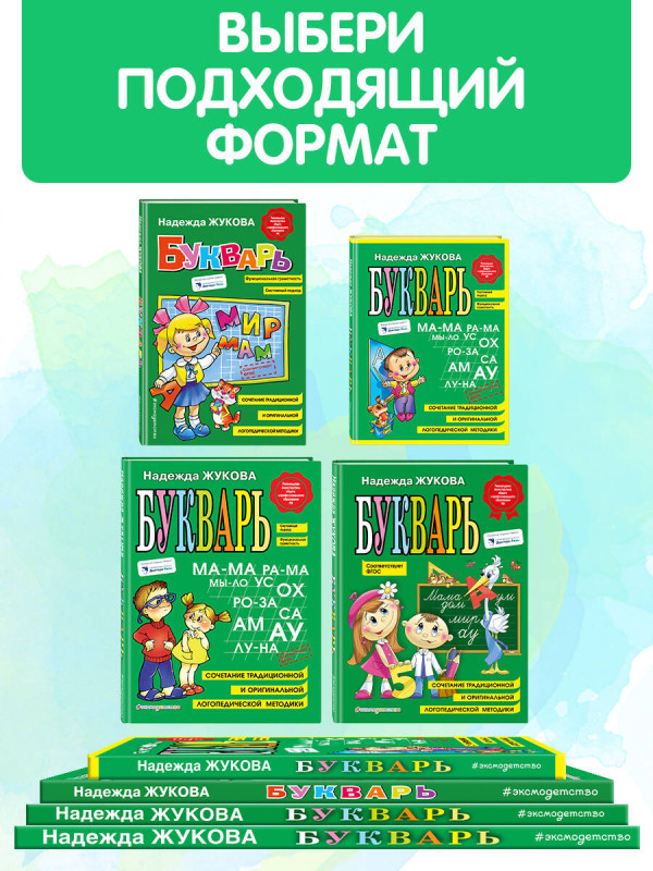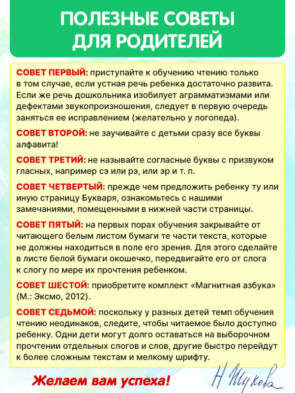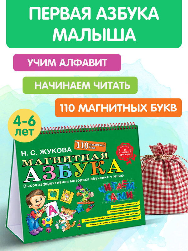 В новом издании знаменитой «Магнитной азбуки» букв стало еще больше. И еще увеличилось количество строк на магнитном мольберте-доске. А это значит, что станет еще веселее играть в школу! Такой комплект подойдет как для индивидуальных занятий дома, так и для занятий в классе или для наглядного обучения в небольших группах. В ПОДАРОЧНЫЙ КОМПЛЕКТ ВХОДИТ: - набор из 110 магнитных букв; - магнитный мольберт-доска; - мешок-сумочка для хранения букв; - методические указания по работе с «Магнитной азбукой» (содержат дополнительные обучающие упражнения). Буквы со специальным цветовым кодом изготовлены из безопасного экологически чистого материала и имеют мягкую, приятную на ощупь специальную поверхность для развития сенсорных «тактильных» ощущений ребенка. Магниты надежно приклеены к буквам, ребенок не сможет оторвать их. Об авторе методики: Надежда Сергеевна Жукова — известный логопед, кандидат педагогических наук, приверженец классической педагогики. В своих книгах она использовала как исследования известных логопедов, так и самостоятельно разработанные оригинальные методики, проверенные временем. Имея большой практический опыт работы с особенными, «трудными» детьми, Надежда Сергеевна создала методику, доступную каждому, уйдя от «наукообразности» и «заумности». Все, кто когда-либо работал с ребенком по пособиям Надежды Жуковой, отмечают простоту подачи материала, легкость усвоения малышами и быструю обучаемость. Меняется окружающий мир, меняются ценности и предпочтения родителей, фокус колеблется от печатной книги к электронным гаджетам. Но как и двадцать лет назад, так и сейчас педагоги и логопеды рекомендуют для занятий с ребенком и обучения чтению зеленые пособия Надежды Жуковой. Если вы захотите продолжить занятия с ребенком по авторской программе Н.С. Жуковой, издательство «ЭКСМО» рекомендует вам обратить внимание на следующие книги: - «Букварь», - «Первая после букваря книга для чтения», - «Уроки чистописания и грамотности», - «Я говорю правильно», - «Я пишу правильно», - «Уроки логопеда».
