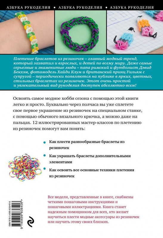 Плетение украшений из резиночек - самый модный вид рукоделия, которым увлечены люди разных возрастов во всех странах мира. Книга, которую вы держите в руках, поможет вам легко и просто освоить это увлекательное хобби. Изучив 15 подробных иллюстрированных мастер-классов, вы сможете плести модные браслеты и фигурки из резиночек для себя и в подарок, сможете разделить свой творческий досуг с детьми. Приятного творчества!