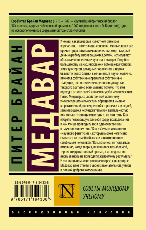 Питер Медавар обращается именно к практической, повседневной стороне жизни людей, занимающихся исследовательской деятельностью или только готовящихся вступить на этот путь. Как избрать подходящую для себя сферу исследований? Как избежать излишнего «научного фанатизма», который может негативно сказаться на семейной жизни или отношениях с любимым человеком? Как, наконец, не поддаться отчаянию, когда теория, казавшаяся незыблемой, терпит сокрушительный провал, а исследования вновь и вновь не приводят к желаемому результату? И это лишь немногие важные вопросы, на которые Медавар дает ответы в своей замечательной, умной и полной доброго юмора книге.