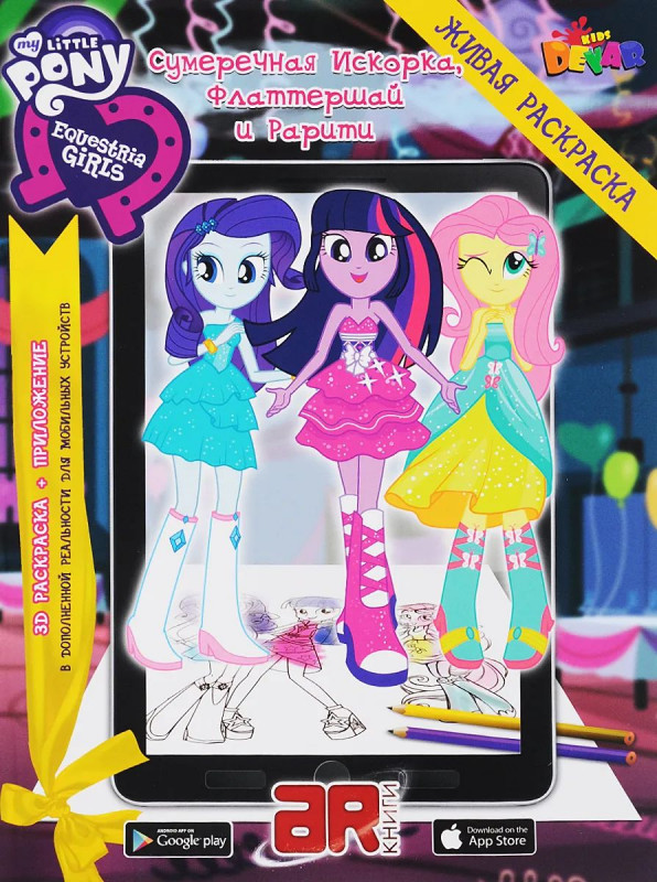 Эта книга полна удивительных сюрпризов! Это не просто раскраска, а целая история с играми и героями Эквестрии, оживающими прямо у тебя на руке! С помощью бесплатного мобильного приложения Devar KIDS ты можешь перенести с экрана Сумеречную Искорку, Флаттершай и Рарити в реальный мир и играть с ними! Хочешь проверить, кто из девочек Эквестрии лучше всех шьёт одежду или кто из них самая застенчивая? Узнай про каждого героя с помощью приложения Devar KIDS! Кстати, на одной из страниц тебя ждёт сюрприз - помоги герою найти книгу заклинаний! А хочешь создать собственный образ любимого героя и увидеть, например, Сумеречную Искорку в другом платье? Раскрась и меняй наряды девочкам из Эквестрии. Собери полную коллекцию, раскрасив все страницы книги, и создавай удивительные образы любимым героям! - Любимый мультфильм с живыми героями у тебя на руке! - 3 главных героя - 7 нарядов - 9 анимационных историй в дополненной реальности*!