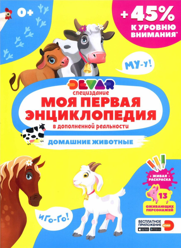 Вопреки названию, о домашних животных не так-то просто узнать, находясь дома. Не беда! Книга "Домашние животные" перенесёт вас на ферму, где обитают коровы, поросята, ослик, лошадь, овечка и другие животные и их детёныши. Используя дополненную реальность, ребёнок сможет "оживить" героев на экране смартфона или планшета: посмотреть, как принимает пылевую ванну индюк, напоить ослика или поиграть в догонялки с овцой. А закрепить знания помогут тематические задания, раскраска и диплом. Кстати, интересные факты животные расскажут о себе сами. Какую обувь носят лошади? Зачем свинье пятачок и почему она купается в грязи? Как козы помогли людям открыть кофе? У каких домашних животных прямоугольные зрачки? Как уши помогают кролику бегать? Энциклопедия "Домашние животные" демонстрирует необычный и современный подход к развитию вашего малыша, способствует формированию речи ребёнка, развивает память и расширяет кругозор.