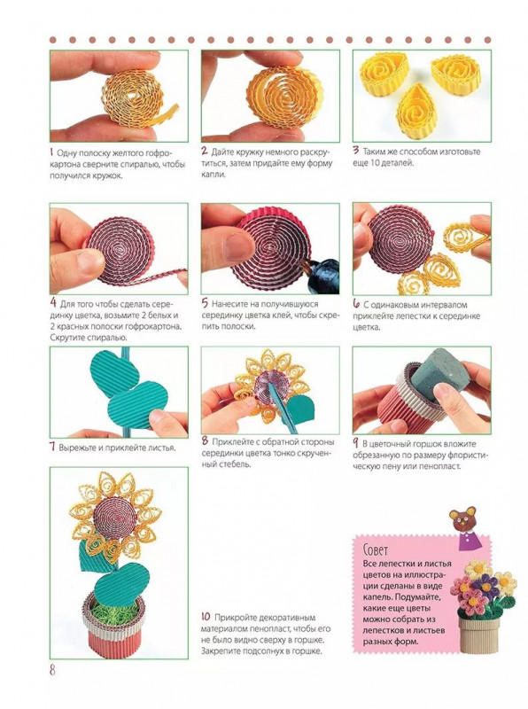 Творческой натуре всегда интересно попробовать что-то новое! Предлагаем вашему вниманию оригинальную и необыкновенно популярную технику - создание фигурок из гофрокартона, или гофроквиллинг. Из этого необычного материала получаются потрясающие поделки! Вы сможете изготовить не только декоративные фигурки зверушек и цветов, но и весьма функциональные аксессуары, например стильные кашпо, оригинальные часы, а также прекрасное панно для украшения интерьера. Откройте в себе новые способности: берите картон, клей, ножницы - и за работу
