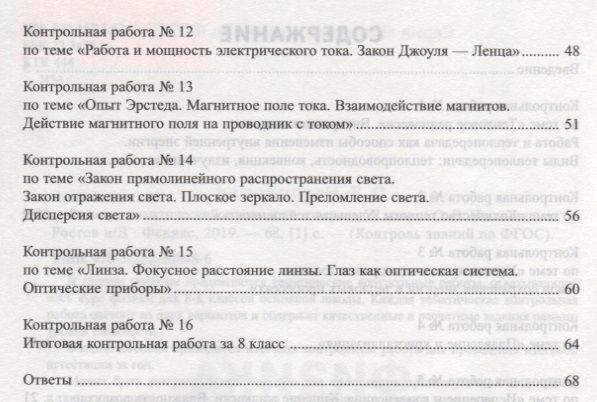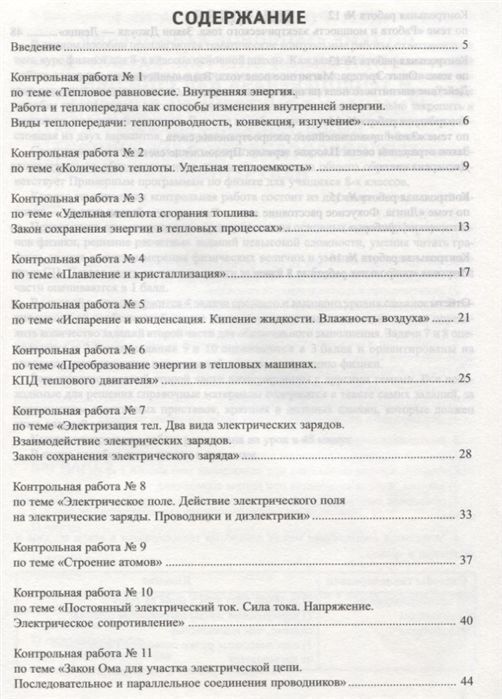 В данном пособии предлагаются тематические контрольные работы, охватывающие весь курс физики для 8-х классов основной школы. Каждая тематическая контрольная работа состоит из двух вариантов и содержит качественные и расчетные задания разного уровня сложности. В конце пособия приводится итоговая контрольная работа для проведения итоговой аттестации за год. Может быть рекомендовано учителю для проведения промежуточной аттестации, а также учащимся - для повторения и закрепления изученного материала.