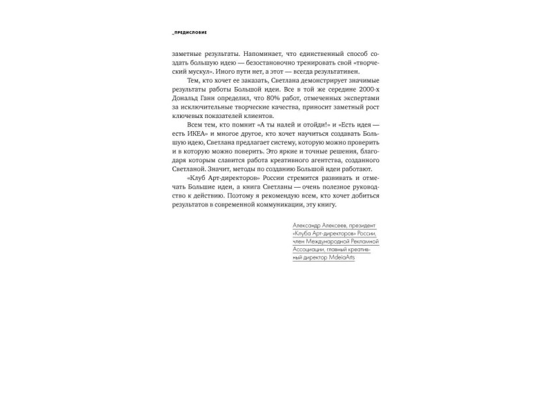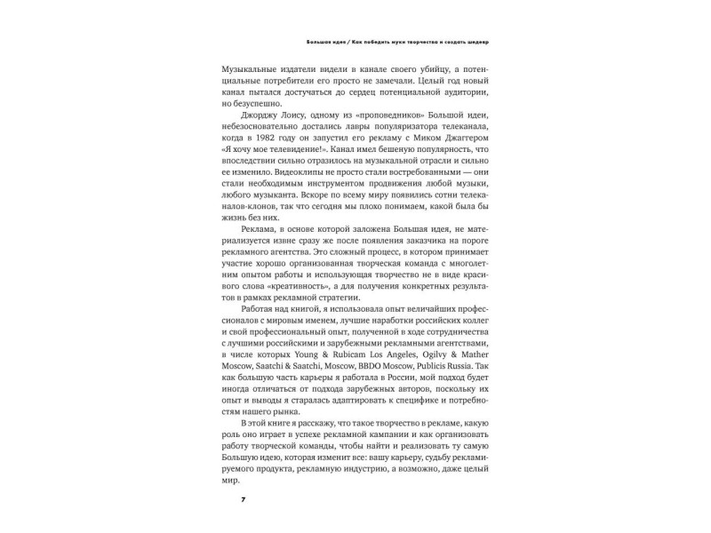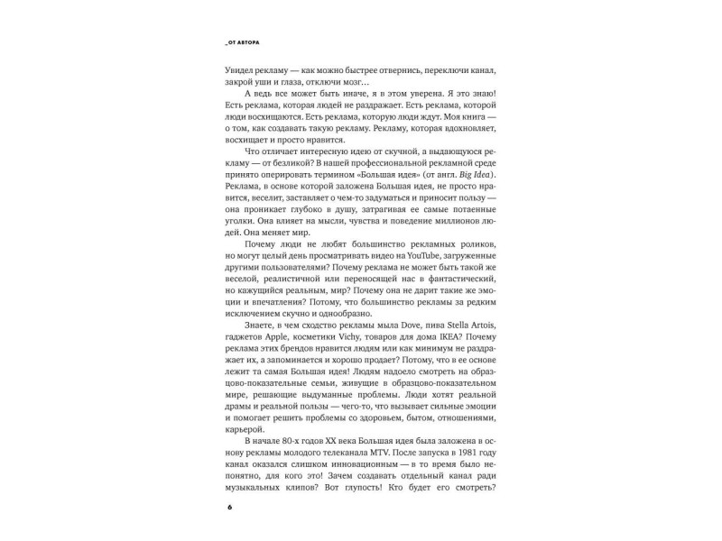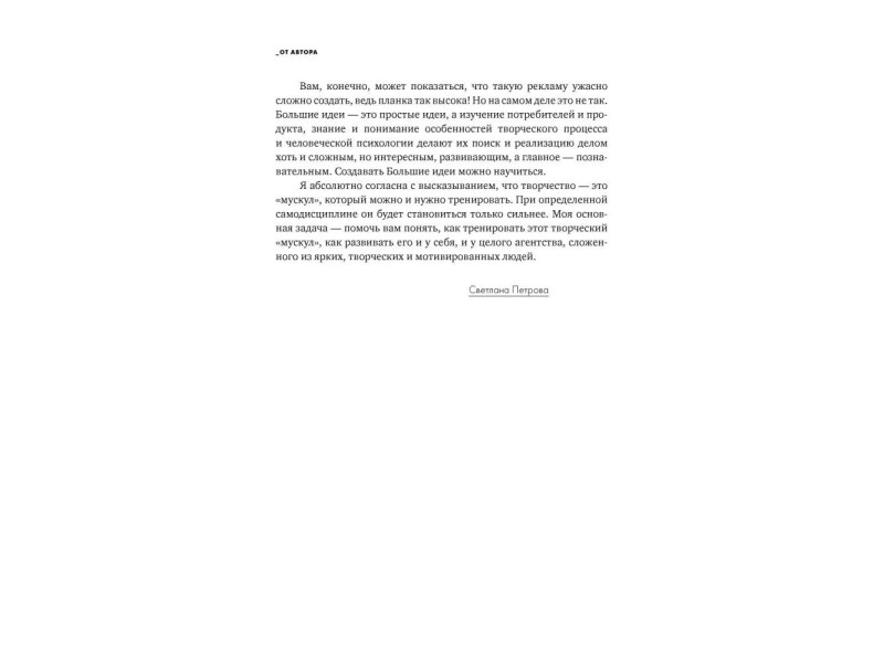Реклама повсюду. Она и привлекает, и раздражает, и формирует наши предпочтения и взгляды… Работаете ли вы в рекламе или только собираетесь - хотите, чтобы рекламные кампании, созданные с вашим участием, любили и запоминали? И возможно ли сегодня в этой непростой индустрии создавать шедевры? Светлана Петрова, известный специалист в области рекламы и брендинга, более 10 лет руководившая ведущими агентствами России, многократно награждаемыми на престижнейших фестивалях мира, в своей книге рассказывает о том, что есть реклама, которая восхищает, и что делать ее нелегко, но как минимум интересно и полезно. На примере хорошо знакомых всем кампаний Светлана показывает, как организовать работу творческой команды, как взаимодействовать с клиентом и как найти и реализовать ту самую Большую идею, которая изменит все: вашу карьеру, судьбу рекламируемого продукта, рекламную индустрию… Обо всем этом и многом другом - рассказ человека, который знает правила игры, как никто другой, а... Обо всём этом и не только в книге Большая идея. Как победить муки творчества и создать шедевр (Светлана Петрова); тираж 1000; 12+; Светлана Петрова; 2016