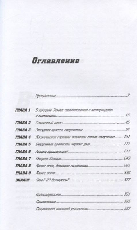 Смерть с небес: Наука о конце света / Филип Плейт; Пер. с англ. — М.: Альпина нон-фикшн, 2020. — 404 с. ISBN 978-5-00139-112-8 Поначалу у читателя этой книги может сложиться впечатление, что Вселенная только и ждет своего апокалипсиса. Но стоит ли на самом деле бояться черных дыр, гамма-всплесков и сверхновых? И если причины для опасений есть, то можем ли мы что-то сделать, чтобы спасти себя? Остроумно и весело известный астрофизик рассказывает о бесчисленных вариантах кон- ца света, которые способен обрушить на нас космос. Предлагая читателю увлекательные и тревожные сюжеты, словно позаим- ствованные из научной фантастики, Филип Плейт сопровождает их комментариями о том, как они могут повлиять на жизнь на Земле и на саму Вселенную, если воплотятся в жизнь. Но автор не ставит своей целью поразить читателя сенсационной ин- формацией: анализируя тот или иной вероятный сценарий, он показывает, как его предотвратить. Это безукоризненно науч- ное, но доступное массовому читателю исследование — прекрасный урок астрономии для новичков и подлинное удовольствие для подготовленных любителей науки. УДК 52 ББК 22.6