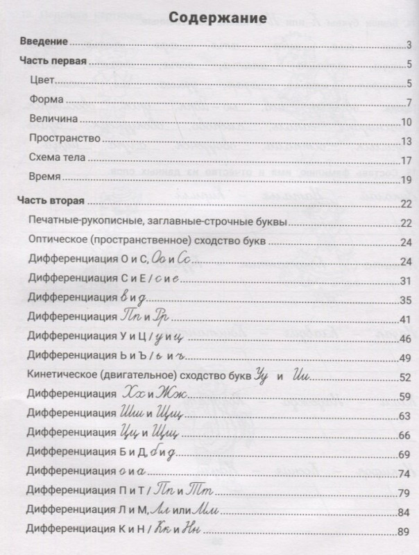 В первой части рабочей тетради представлены упражнения на развитие у ребёнка логического мышления, ориентировки во времени и пространстве, а также на формирование правильной схемы своего тела, совершенствование зрительного и слухового восприятия, памяти. Во второй части даны задания по преодолению часто встречающихся стойких оптико-пространственных замен букв.