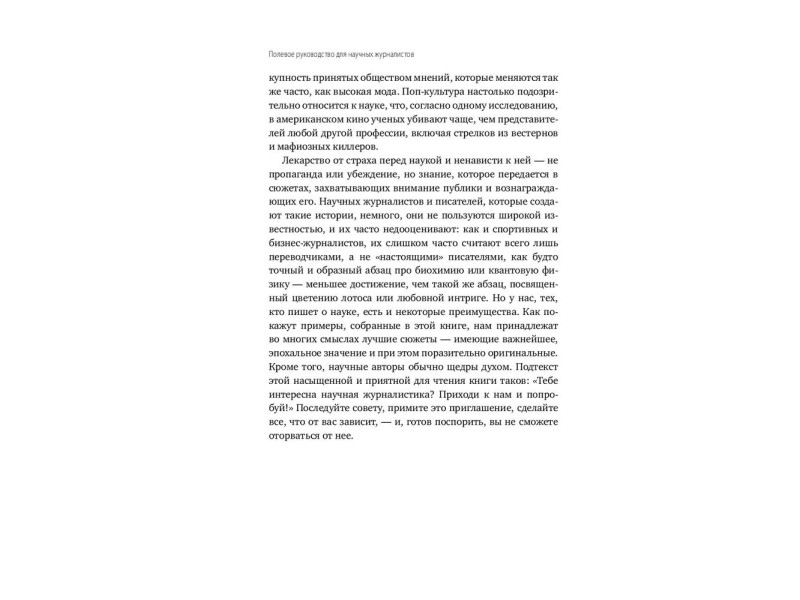 Современные СМИ пестрят новостями о глобальном потеплении, исследовании стволовых клеток, биологическом оружии или этических проблемах изучения наших генов. Никогда прежде диалог между миром науки и широкой общественностью не был так актуален. В предлагаемом читателю официальном руководстве Национальной ассоциации научных журналистов, ведущие специалисты в своей области, делятся секретами ремесла - от поиска идей и источников до безупречного стиля. Авторы объясняют, как пробиваться через информационный поток к действительно важным сюжетам и как написать захватывающую историю, способную заинтересовать как специалиста, так и простого обывателя; тираж 2000; перевод с английского; под редакцией Деборы Блюм, Мэри Кнудсон, Робин Маранц Хениг ; [переводчик Ольга Добровидова]; 2018