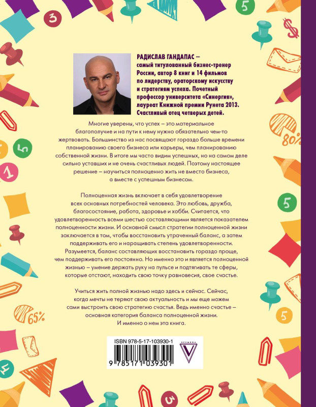 18+ НЕЗАКОННОЕ ПОТРЕБЛЕНИЕ НАРКОТИЧЕСКИХ СРЕДСТВ, ПСИХОТРОПНЫХ ВЕЩЕСТВ, ИХ АНАЛОГОВ ПРИЧИНЯЕТ ВРЕД ЗДОРОВЬЮ, ИХ НЕЗАКОННЫЙ ОБОРОТ ЗАПРЕЩЕН И ВЛЕЧЕТ УСТАНОВЛЕННУЮ ЗАКОНОДАТЕЛЬСТВОМ ОТВЕТСТВЕННОСТЬ ?Многие уверены, что успех - это материальное благополучие и на пути к нему нужно обязательно чем-то жертвовать. Большинство из нас посвящают гораздо больше времени планированию своего бизнеса или карьеры, чем планированию собственной жизни. В итоге мы часто видим успешных, но на самом деле сильно уставших и не очень счастливых людей. Поэтому настоящее решение - научиться полноценно жить не вместо бизнеса, а вместе с успешным бизнесом. Полноценная жизнь включает в себя удовлетворение всех основных потребностей человека. Это любовь, дружба, благосостояние, работа, здоровье и хобби. Считается, что удовлетворенность всеми шестью составляющими является показателем полноценности жизни. И основной смысл стратегии полноценной жизни заключается в том, чтобы восстановить утраченный баланс, а затем поддерживать его и наращивать степень удовлетворенности. Разумеется, баланс составляющих восстановить гораздо проще, чем поддерживать его постоянно. Но именно это и является полноценной жизнью - умение держать руку на пульсе и подтягивать те сферы, которые отстают, находить свою точку равновесия, свое счастье. Учиться жить полной жизнью надо здесь и сейчас. Сейчас, когда мечты не теряют свою актуальность, и мы еще можем сами выстроить свою стратегию счастья. Ведь именно счастье - основная категория баланса полноценной жизни. И именно о нем эта книга.