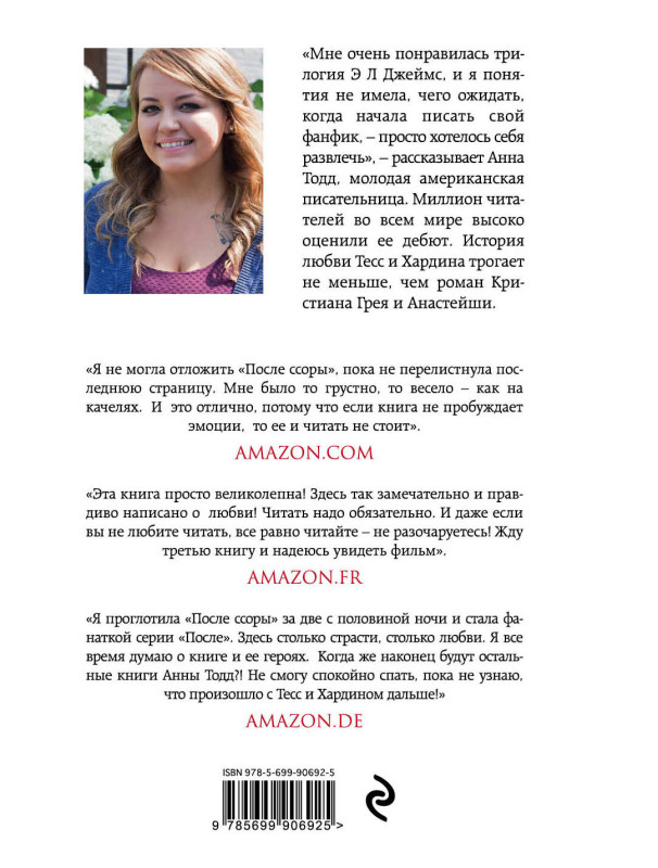 «Я проглотила "После ссоры" за две с половиной ночи и стала фанаткой серии "После". Здесь столько страсти, столько любви. Я все время думаю о книге и ее героях. Когда же наконец будут остальные книги Анны Тодд?! Не смогу спокойно спать, пока не узнаю, что произошло с Тессой и Хардином дальше!» — Amazon