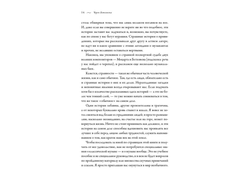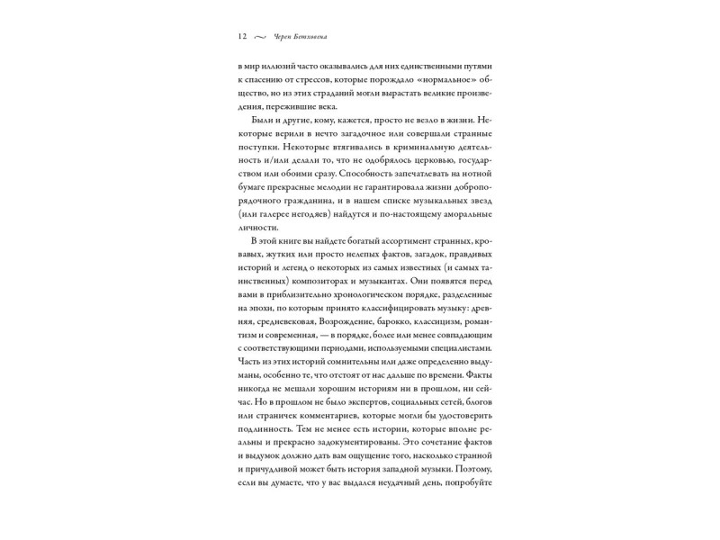 «Череп Бетховена» — книга об истории классической музыки, в которой нет перечней дат и имен, зато есть рассказы о жестокости, мести, смертях, болезнях, любовных победах и поражениях, казнях, привидениях и войнах. В книге вы прочитаете о том, что музыка может доводить до сумасшествия и даже до самоубийства, узнаете, за что кастрировали Абеляра, почему враждовали Сен-Санс и Дебюсси и чего боялся Моцарт. Вы поймете, что знаменитые композиторы вовсе не небожители. Они попадали в передряги, напивались, дрались и влюблялись, а в перерывах сочиняли музыку, которую мы теперь называем классической. Вы по-новому посмотрите на давно известные произведения, а самое главное — разберетесь, что же случилось с черепом Бетховена.