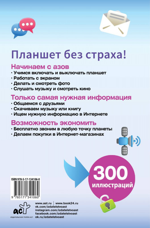 Простые и подробные инструкции быстро научат вас включать и выключать планшет, настроить его под себя. Вы сможете смотреть любимые сериалы, писать сообщения, делать фото и отправлять их родным и друзьям, искать информацию в сети Интернет, бесплатно звонить по всему миру и совершать покупки в интернет-магазинах. И все это — без сложных слов и ненужных подробностей!