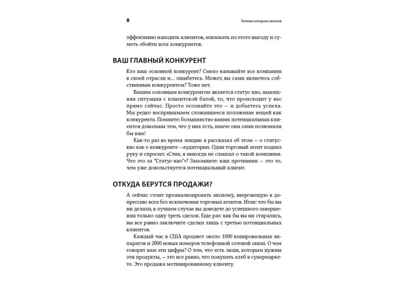 Любой менеджер по продажам знает, как сложно звонить незнакомым людям и предлагать свою услугу или товар. Зачастую результатом холодного звонка бывает отговорка или просто отказ. Автор книги Стивен Шиффман утверждает, что холодные звонки — это не проклятье менеджера, а его возможность, благодаря которой будет обеспечен личный профессиональный успех и финансовое процветание компании.