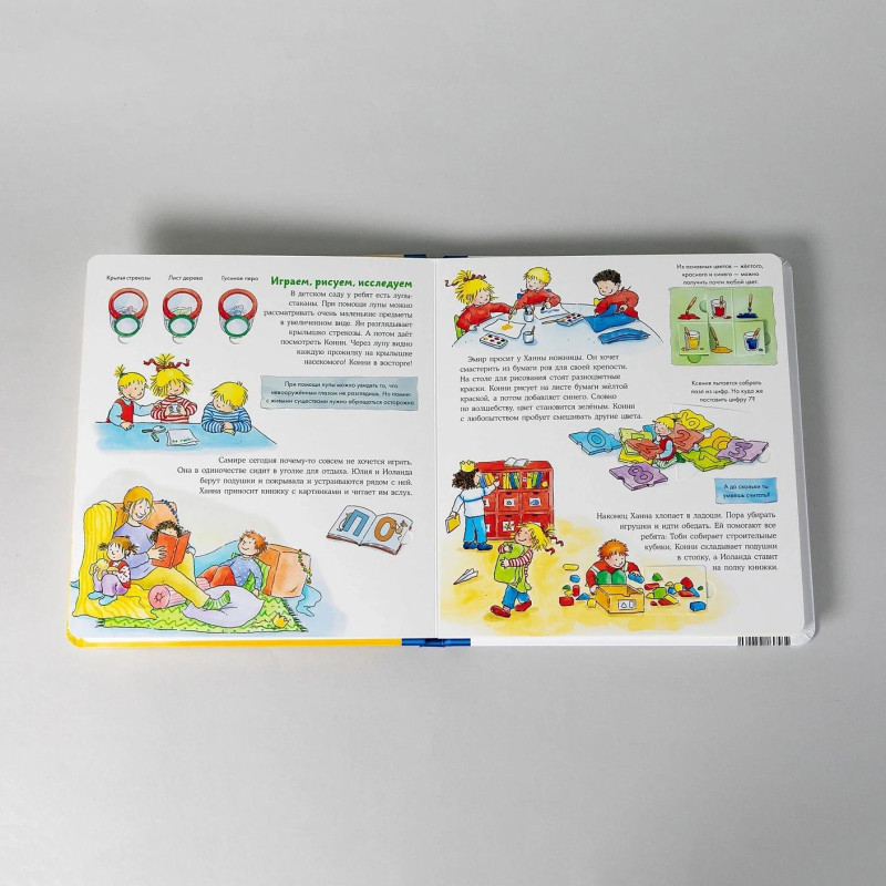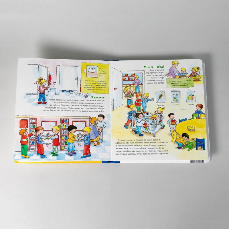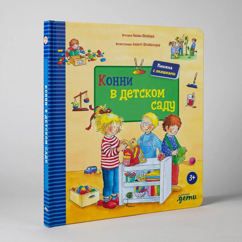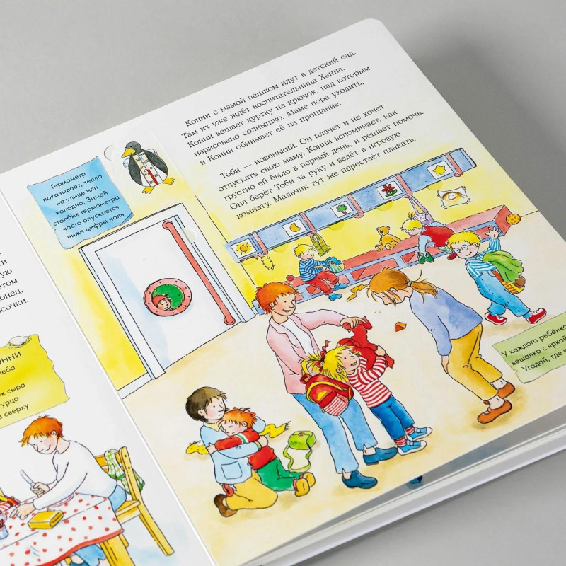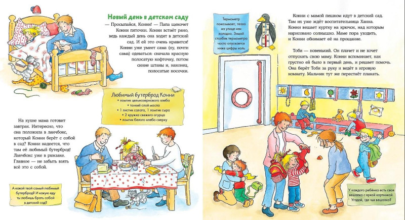 Конни очень любит ходить в детский сад! Она уже знает, как там всё устроено, и с радостью расскажет вам. Вместе с Конни ребёнок легко привыкнет к новой обстановке, познакомится с распорядком дня в садике и полюбит совместные игры. А ещё в книжке с окошками можно открыть дверь в детский сад и даже рассмотреть разные игры и игрушки! Особенности: Большой формат, плотные картонные страницы, полноцветные иллюстрации, окошки. Для кого: Для тех, кто готовится идти в детский сад, или уже ходит, но не очень его любит. Для детей от 3 лет, мальчиков и девочек.