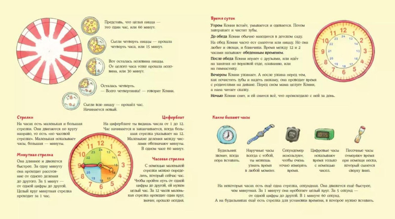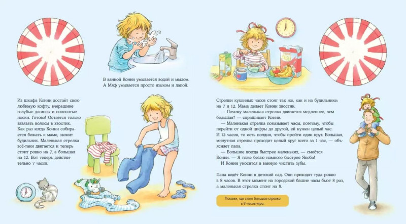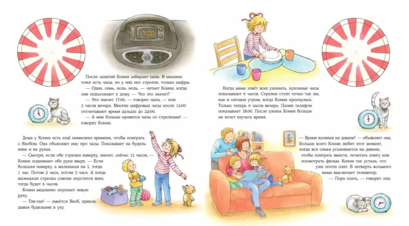 Бабушка подарила Конни будильник, и теперь её любимое занятие — определять время. Интересно, почему большая стрелка двигается быстрее, чем маленькая? А четверть часа — это сколько? И что можно успеть сделать за секунду? Внутри книги вы найдёте: • Часы с настоящими стрелочками • Подсказки, как определять время • Гид по разным видам часов О серии: Вот уже 20 лет малыши во всем мире растут вместе с Конни — доброй девочкой в забавной полосатой футболке. С этими книгами ребенок перестанет бояться врача, первого дня в садике или школе, поймет, что животные в доме — это большая ответственность. Серия охватывают все жизненные навыки, с которыми ребенок встречается во время взросления от 3 до 15 лет. Ассоциируя себя с главной героиней, малыш проживает ее историю, учится и познает мир. Для кого: Для детей от 4 лет, мальчиков и девочек.