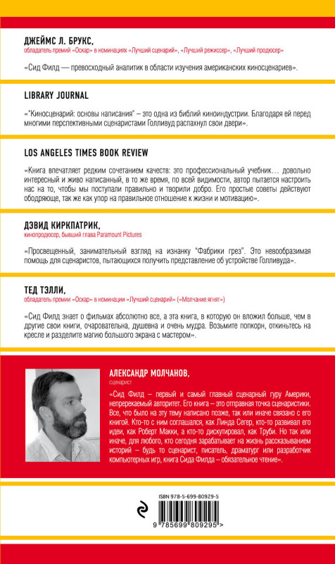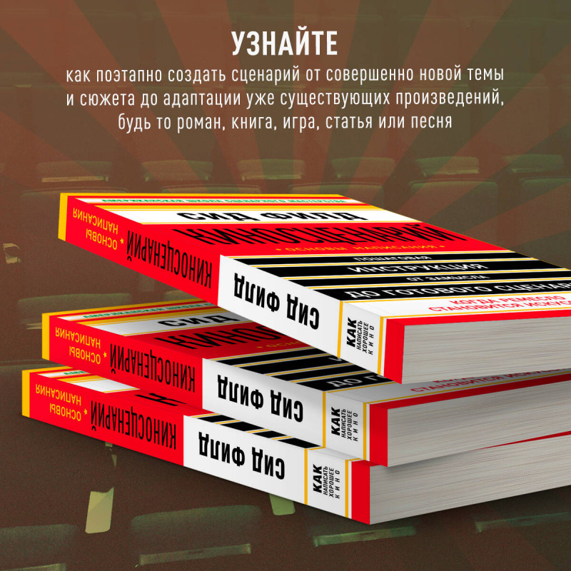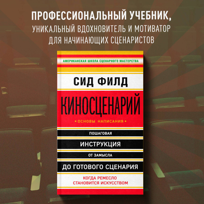 НЕЗАКОННОЕ ПОТРЕБЛЕНИЕ НАРКОТИЧЕСКИХ СРЕДСТВ, ПСИХОТРОПНЫХ ВЕЩЕСТВ, ИХ АНАЛОГОВ ПРИЧИНЯЕТ ВРЕД ЗДОРОВЬЮ, ИХ НЕЗАКОННЫЙ ОБОРОТ ЗАПРЕЩЕН И ВЛЕЧЕТ УСТАНОВЛЕННУЮ ЗАКОНОДАТЕЛЬСТВОМ ОТВЕТСТВЕННОСТЬ. Об издании Сид Филд — знаменитый сценарист, чьи книги стали бестселлерами и переведены на многие языки мира. Их рекомендуют своим ученикам именитые и состоявшиеся сценаристы, режиссеры и продюсеры. «Киносцнарий: основы написания» — это прекрасный помощник начинающего сценариста. Удобное и интересное руководство, которое будет интересно не только тем, кто только делает первые шаги в области написания сценариев, но и опытным мастерам этого дела. Автор рассказывает, как поэтапно создать сценарий от совершенно новой темы и сюжета до адаптации уже существующих произведений, будь то роман, книга, игра, статья или песня. «Замечательная помощь для сценаристов. Я всегда советую молодым сценаристам взять эту книгу и прочитать от корки до корки, после чего либо принять ее полностью, либо взбунтоваться против нее. В любом случае эта книга точно направит мысли в нужное русло». — Дэвид Кепп, обладатель различных кинопремий в номинации «Лучший сценарий», режиссер фильмов «Человек-паук», «Тайное окно», «Война миров»