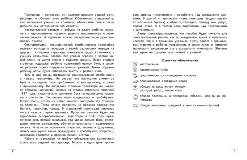 Уважаемые взрослые! Недостаток времени на овладение навыком письма в учебных программах сказывается, прежде всего на том, как пишут ваши дети. Путаница в элементах букв, зеркальное написание, пропуски и замены наряду с неразборчивым почерком - это камень преткновения для многих маленьких учеников. Предлагаем вам помощь в решении этой проблемы - не совсем обычный тренажёр по чистописанию. Это не прописи, а именно тренажёр по чистописанию для детей, уже умеющих писать. Пособие предназначено для комплексного развития многих практических навыков и умений ученика начальной школы, а учебные материалы соответствуют федеральному государственному образовательному стандарту. В то же время у нашего тренажёра есть ряд отличительных черт. Например, специфической особенностью пособия является помощь в переходе с одной разлиновки тетради на другую, а также страница-образец старых советских прописей.