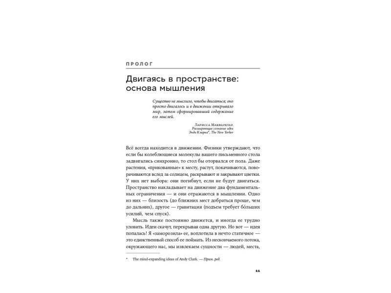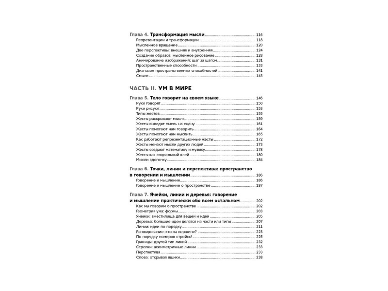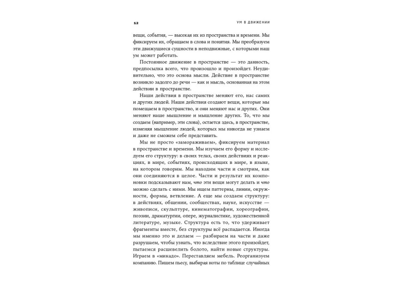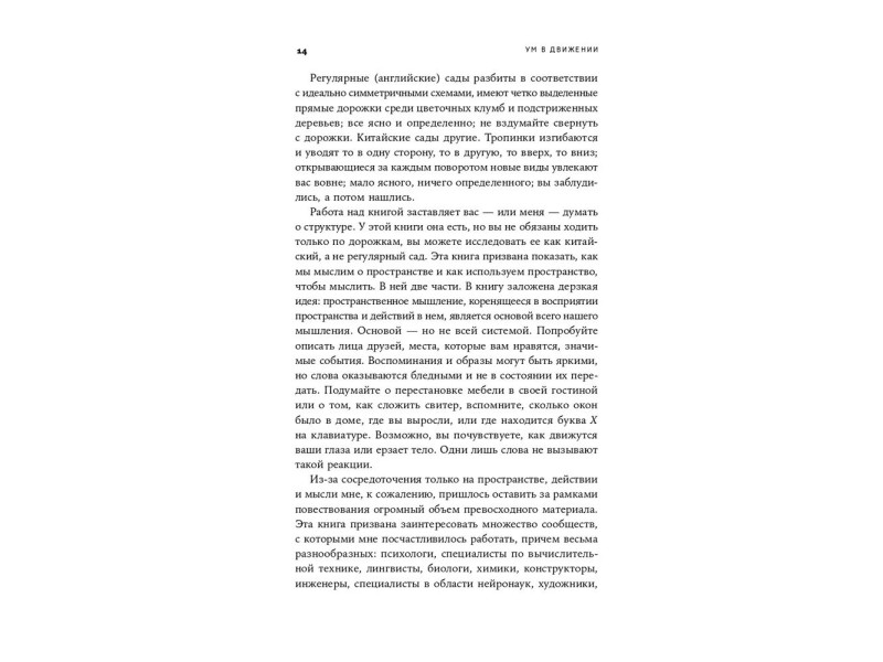 Книга известного когнитивного психолога Барбары Тверски посвящена пространственному мышлению. Это мышление включает в себя конструирование «в голове» и работу с образами в отношении не только физического пространства, но и других его видов — пространств социального взаимодействия и коммуникации, жестов, речи, рисунков, схем и карт, абстрактных построений и бесконечного поля креативности. Ключевая идея книги как раз и состоит в том, что пространственное мышление является базовым, оно лежит в основе всех сфер нашей деятельности и всех ситуаций, в которые мы вовлекаемся.