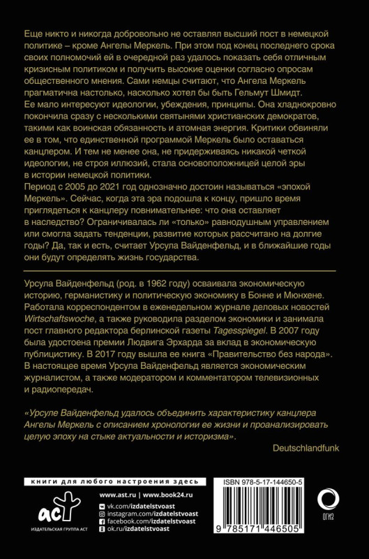 Биография канцлера Германии Ангелы Меркель от экономического журналиста Урсулы Вайденфельд. Эта книга не просто подведение итогов. Она призвана справедливо оценить феномен Меркель и нарисовать портрет женщины, которая изменила Германию. Книга напечатана на белой офсетной бумаге, цветные форзацы.