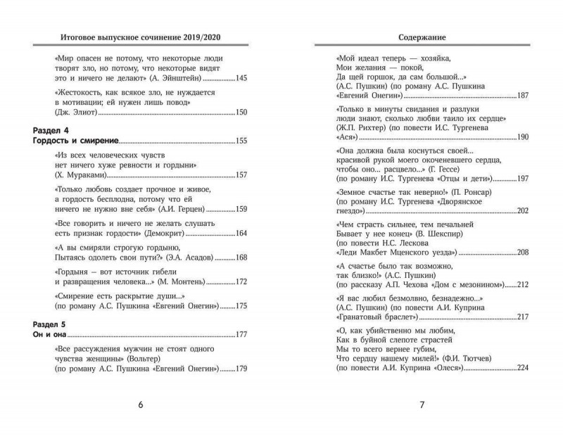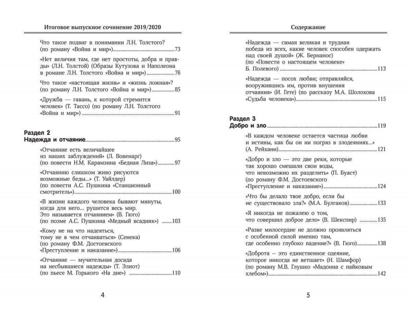 Предлагаемая книга представляет собой сборник сочинений, соответствующих тематическим направлениям выпускного итогового сочинения для школьников 2019-2020 гг.: «Война и мир», «Надежда и отчаяние», «Добро и зло», «Гордость и смирение», «Он и она». По каждому тематическому направлению разработан ряд тем, озвученных в виде подходящих цитат и афоризмов. Сборник небольшого объема, но содержит весь необходимый, тематически разнообразный материал для подготовки к итоговому сочинению. Книга адресована школьникам, абитуриентам, преподавателям.