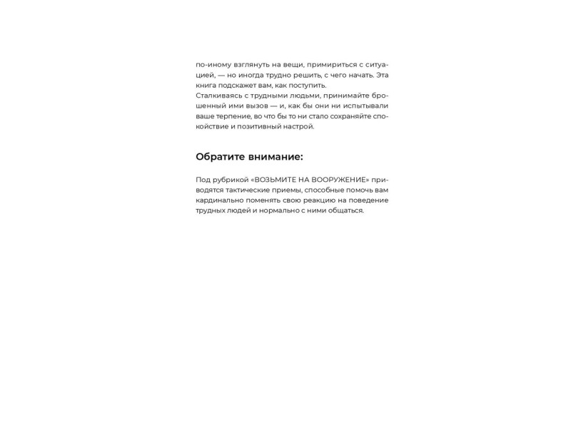 Майк Эннесли, психолог с большим стажем, рассказывает, как четко и безопасно выстраивать коммуникацию с трудными людьми самых разных типов: распознавать их цели и предугадывать нежелательные действия, подмечать слова-маяки, указывающие, что собеседник вот-вот перейдет в наступление; четко обозначать границы, делать свои аргументы убедительными, правильно проявлять сочувствие и понимание. Каждая рекомендация подкрепляется пошаговыми инструкциями. Используя предлагаемые автором инструменты, вы научитесь менять самые сложные ситуации в свою пользу. 12+; 2022; Dealing With Difficult People: Listening and understanding, dealing with emotions, negotiation skills, everyday situations; пер. с англ.